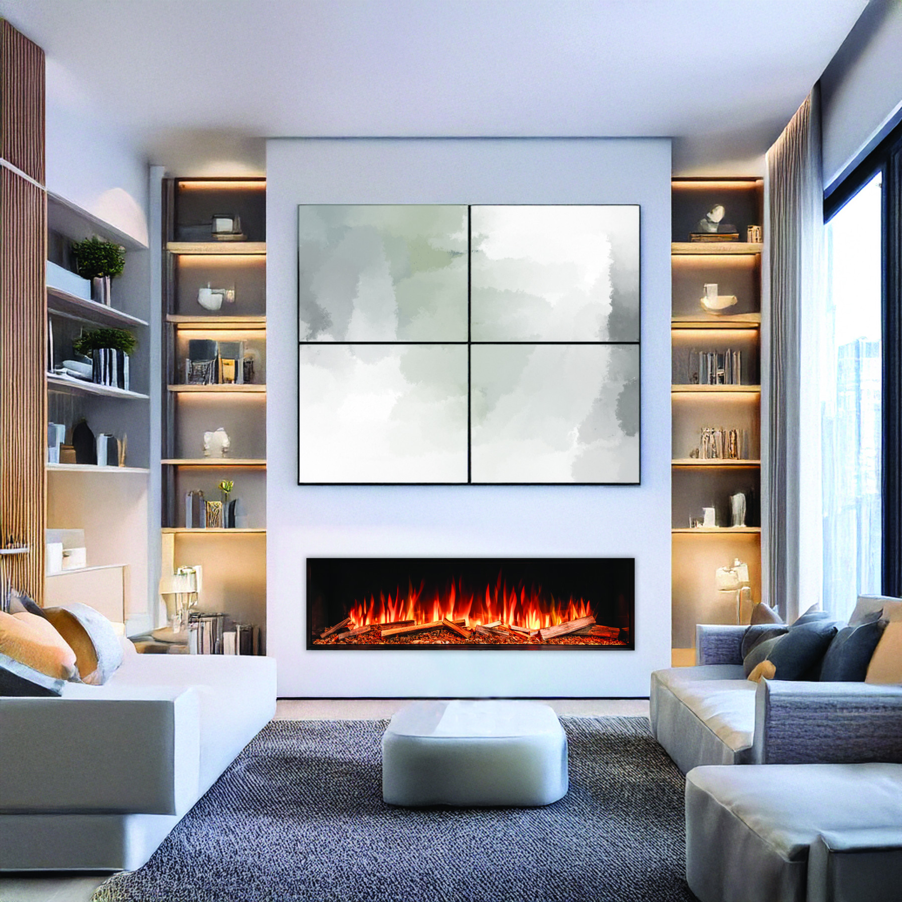 Large chopped real wood is accompanied by crystals, wood chips and ash pieces to give an authentic look to your media wall.